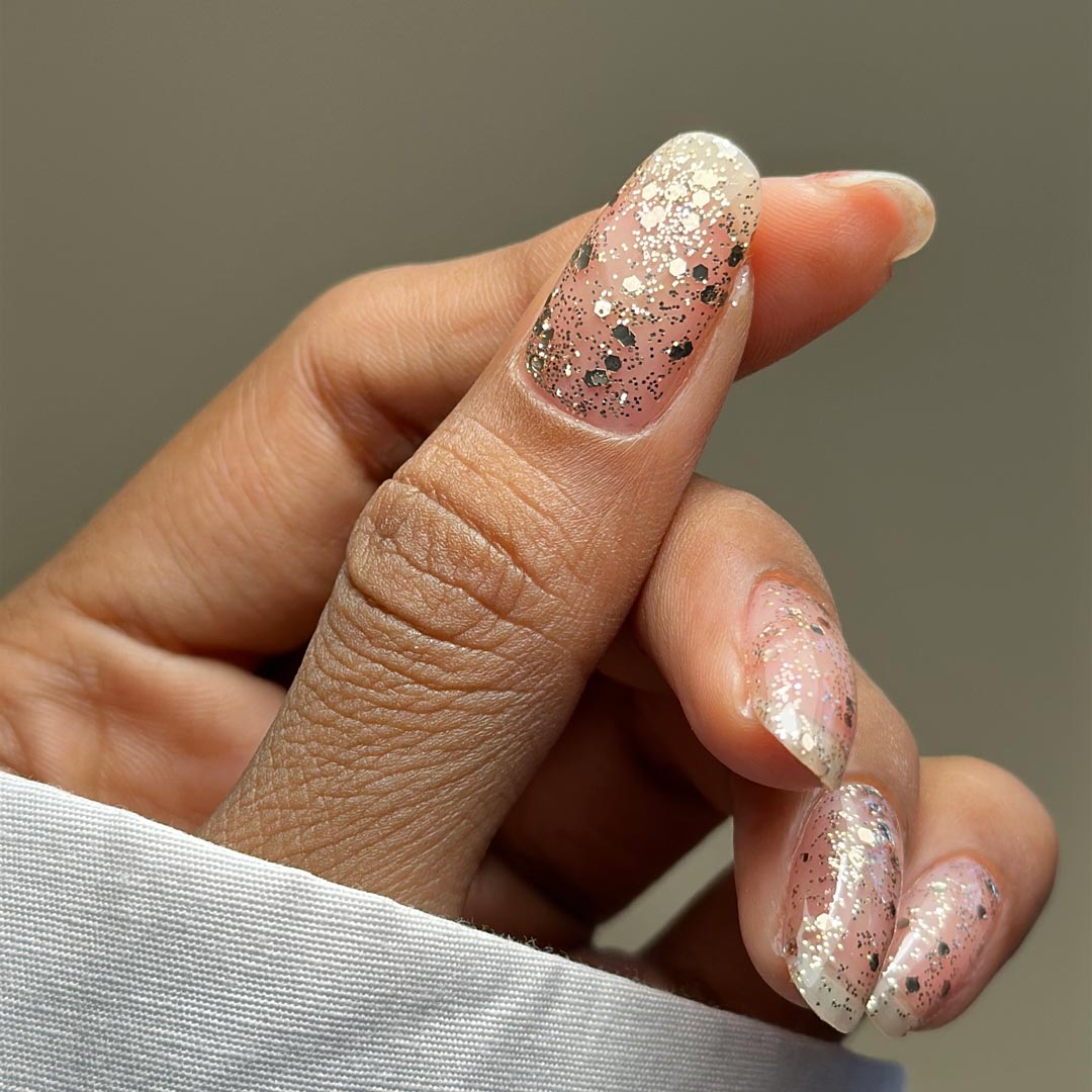 Clicquot - A sheer gel bursting with celebratory sparkle. This luxe formula is packed with chunky champagne glitter particles, balanced beautifully with delicate flecks of fine gold. Layer for a bold, dazzling statement or sweep on a single coat to transform any shade into a sparkling toast to glamour.
