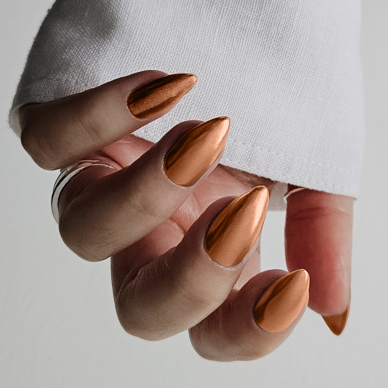 Ein dezentes Kupferchrom, das wie eine frisch geprägte Münze glänzt. Kombinieren Sie es mit dunklen Brauntönen für einen satten, dekadenten Look.